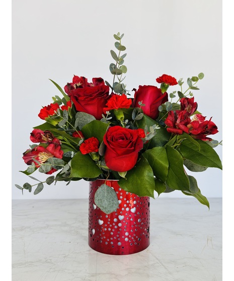 I Heart You Bouquet, featuring red roses, alstroemeria, and carnations arranged in a red metal lantern adorned with charming heart and dot cutouts-a heartfelt Valentine's Day keepsake. The lantern vase is 4" tall.