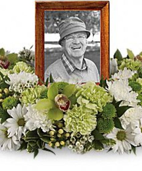 Keep fond memories close to your heart with a floral wreath of white chrysanthemums, green cymbidium orchids and carnations. •Lovely flowers such as white chrysanthemums, green cymbidium orchids and carnations. Please note: Arrangement does not include picture frame. •Approximately 20" W x 14" H